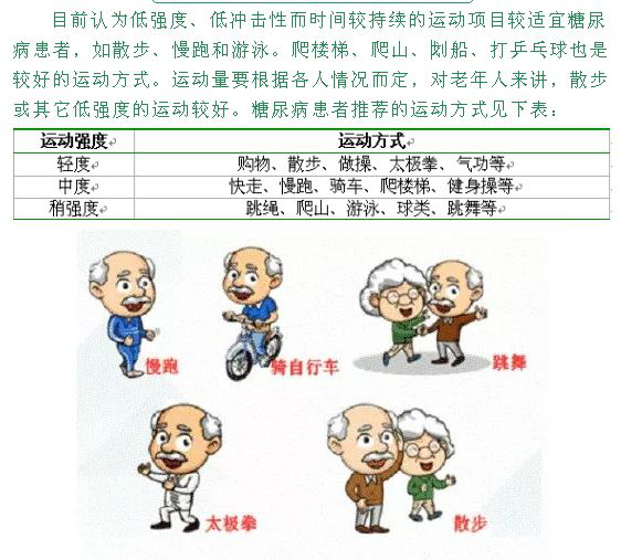 有规律地进行适量运动,每周150分钟,餐后1-3小时开始运动,中低强度有氧运动,如慢跑,游泳,骑车等,配合抗阻训练。并随身携带葡萄糖或者其他食物,避免出现低血糖导致昏迷。